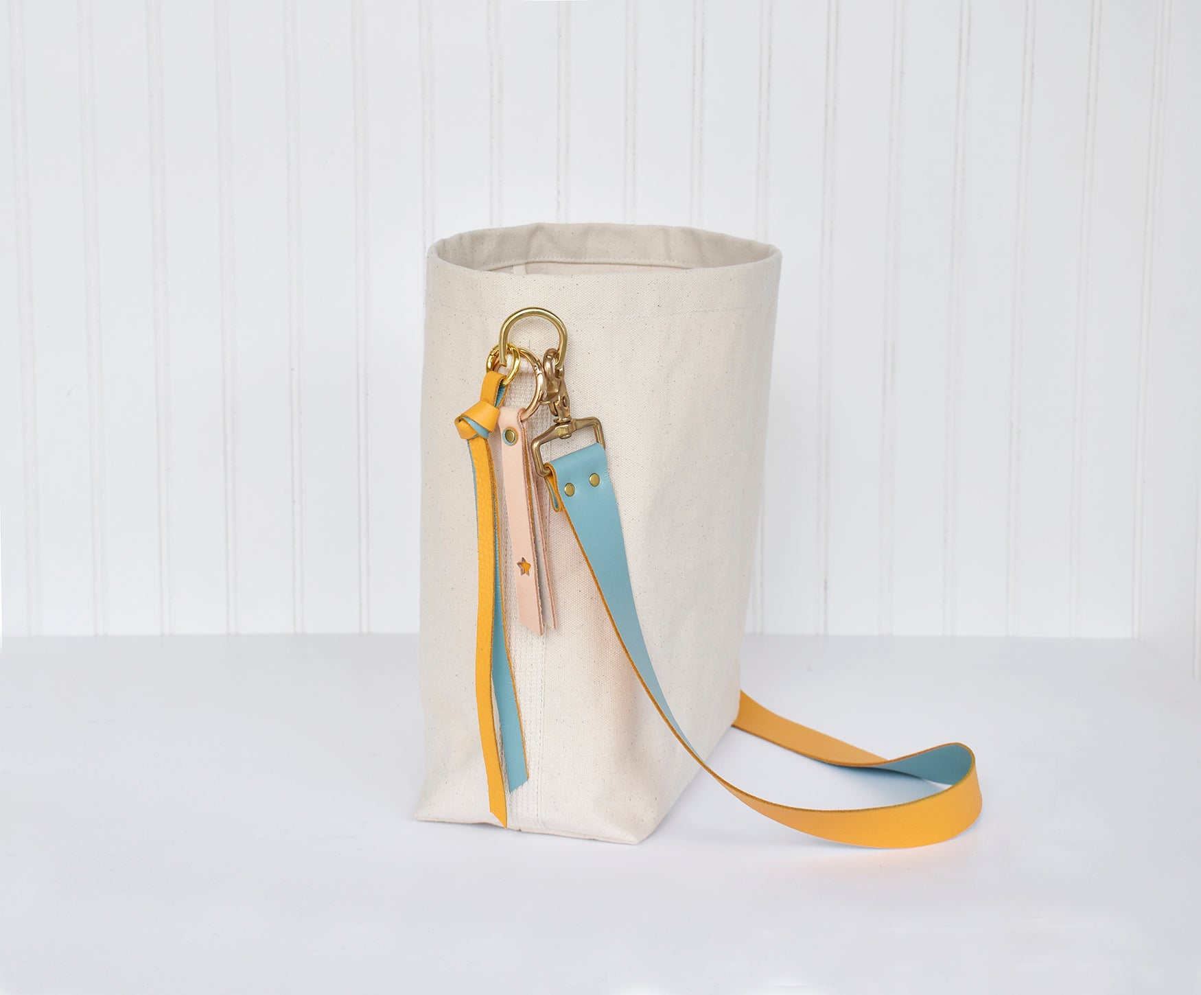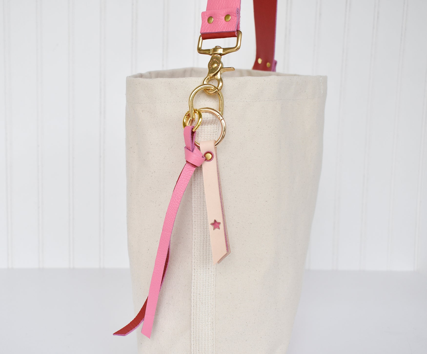 With a small 25mm O-ring and push-spring clip, it’s easy to slip onto your tote or loop around your backpack strap. The genuine leather softens over time, making it better the more you carry it. The ring is 18k gold lasting plated brass.