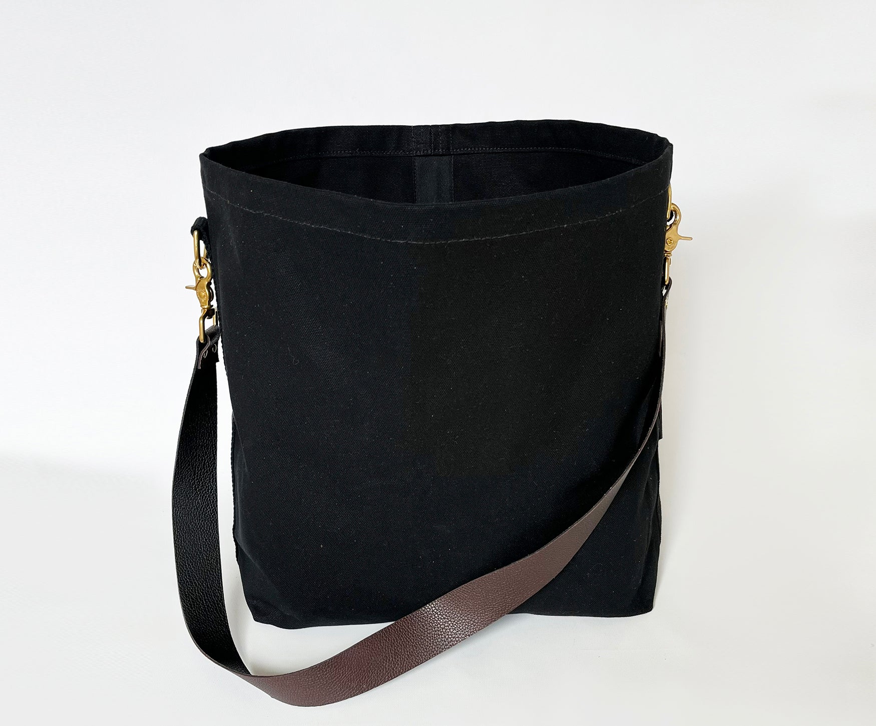 Tote Bag Black- Leather Strap Chocolate