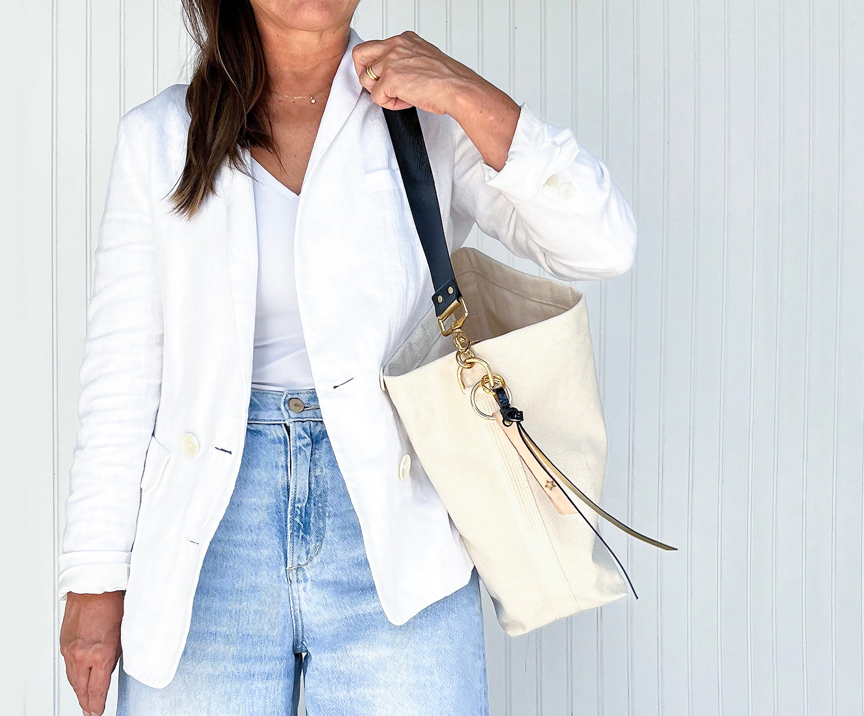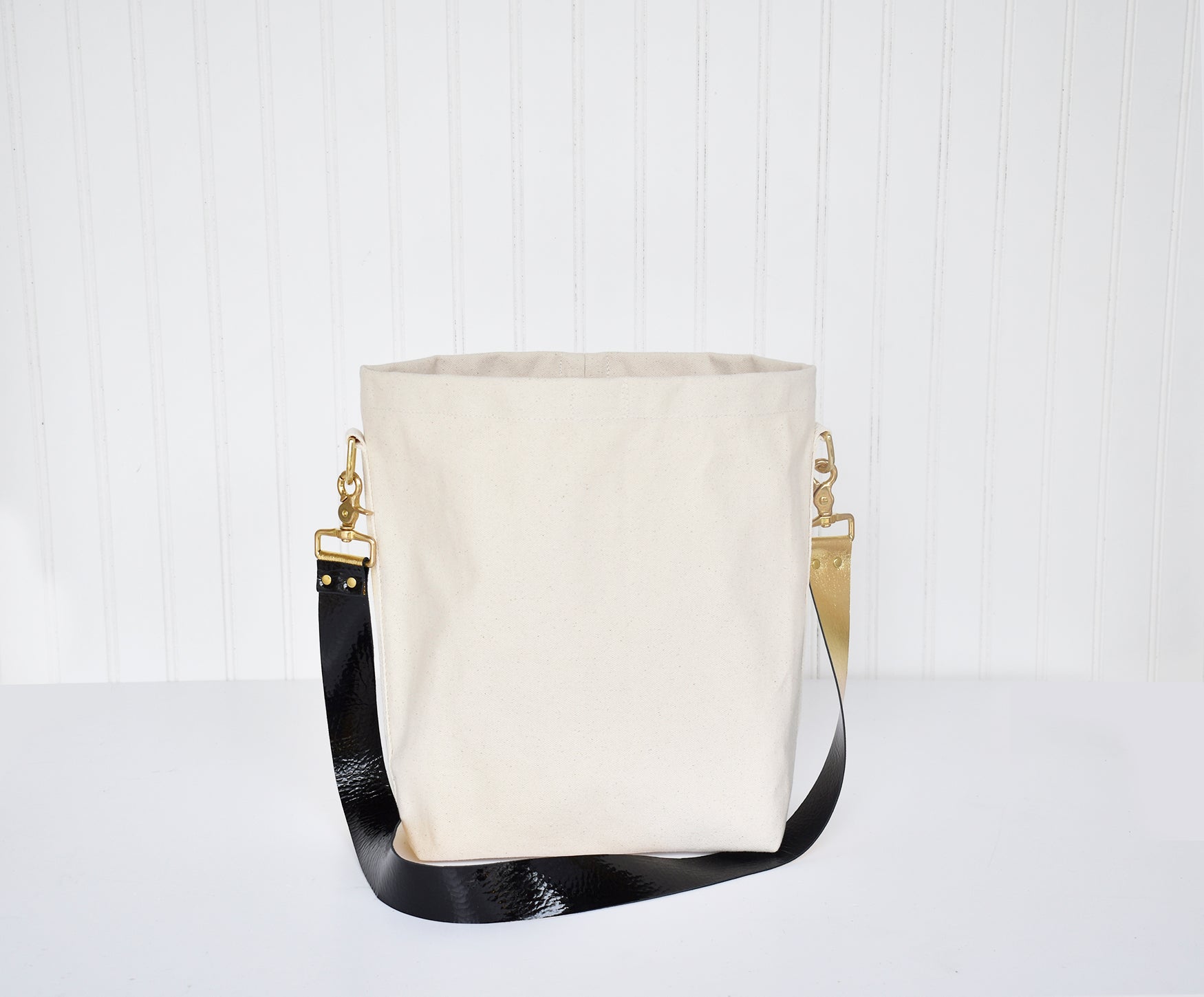 Made from our signature durable cotton canvas, both sizes are lightweight, machine washable, and built to last. Each tote features a premium leather strap (choose Crossbody or Shoulder) and solid brass hardware for strength and elegance.
